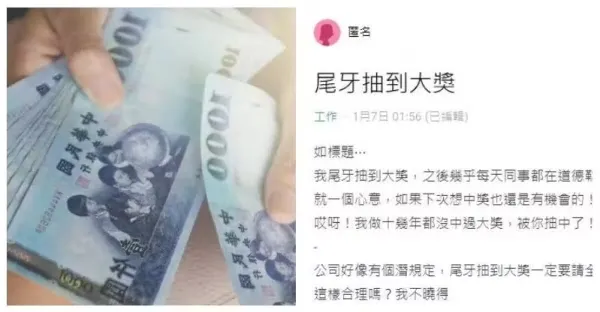 尾牙中頭獎!她被逼「請全公司喝飲料」不忍了 氣喊才1萬元「就要當小氣鬼」網讚翻