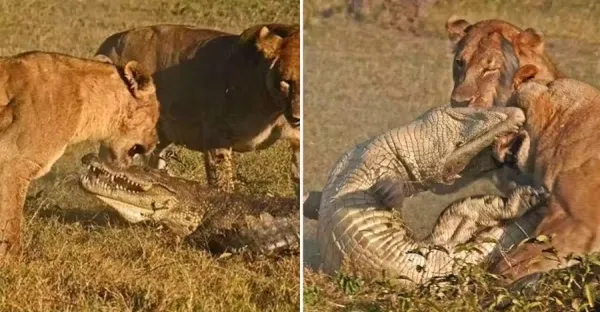 一隻鱷魚想要偷襲幼獅,遭獅群反擊,身體被掀翻成晚餐