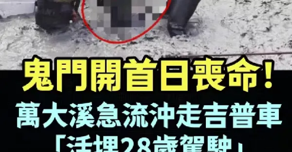 鬼門開首日喪命!萬大溪急流沖走吉普車「活埋28歲駕駛」只露出右小腿,全身遭砂石埋沒