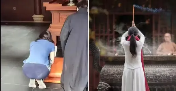 女生寺廟拜佛求願,虔誠下跪祈禱,「一細節」慘遭路人狠批:對神明大不敬!