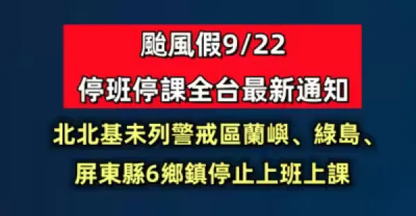 快訊/颱風假9/22停班停課全台最新通知 ,北北基未列警戒區 蘭嶼、綠島、屏東縣6鄉鎮停止上班上課!