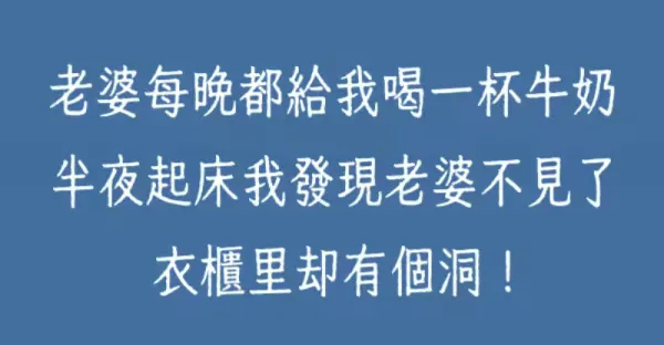老婆每晚都給我喝一杯牛奶,半夜起床我發現老婆不見了,衣櫃里卻有個洞!!